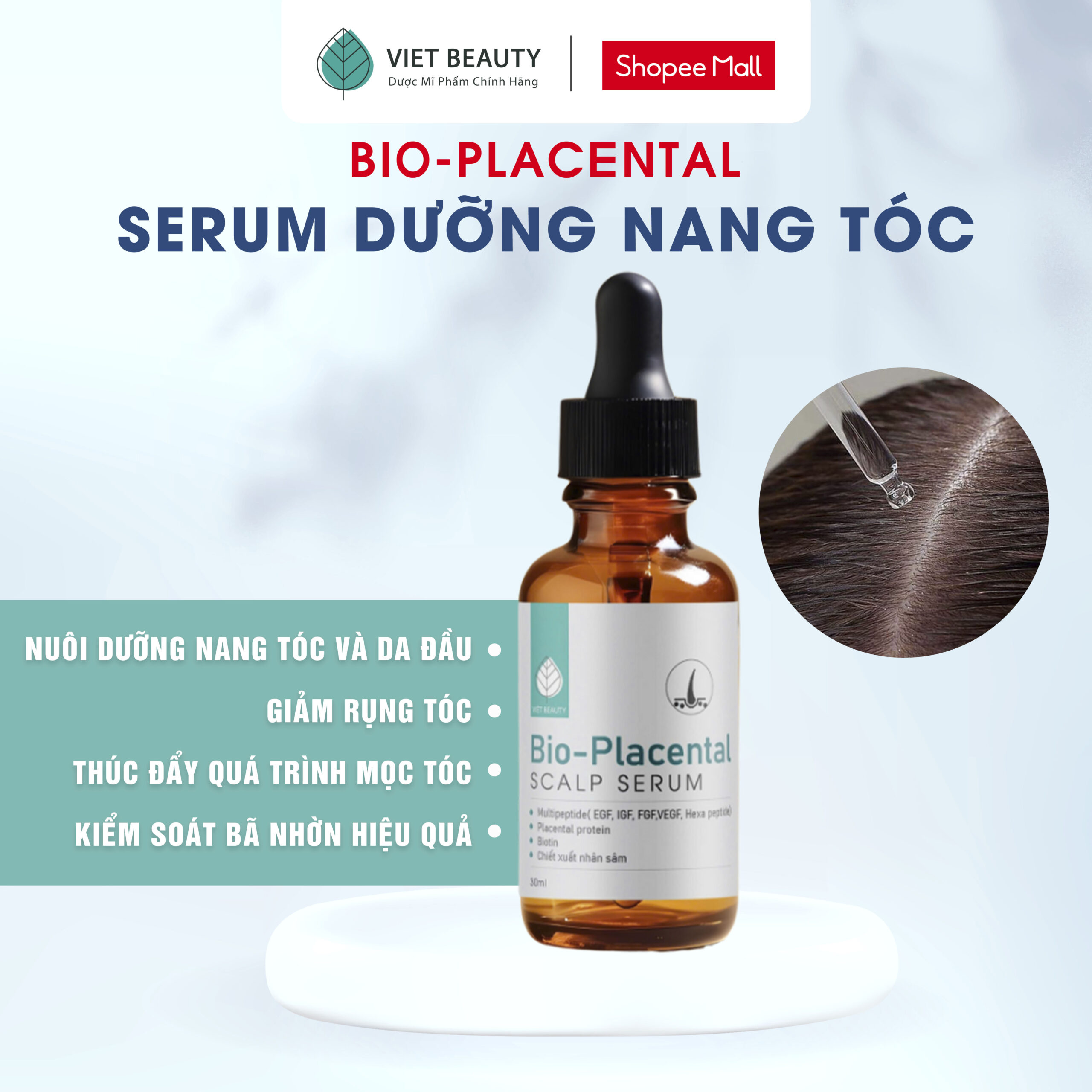 Serum dưỡng nang tóc và da đầu Bio-Placental hỗ trợ kích tóc mọc nhanh, giảm tóc gãy rụng, da đầu bết, bóng dầu. Chân tóc sách và phồng hơn trong thời gian dài hơn so với chỉ gội đầu thông thường. Sử dụng sản phẩm trước có thể hỗ trợ và nâng cao hiệu quả các serum dưỡng tóc chuyên sâu khác Dùng trực tiếp lên da đầu và không cần xả hay gội lại.